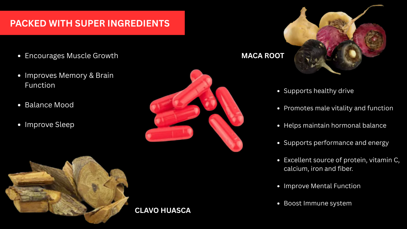 Crafted with the potency of Maca Root and Clavo Huasca for natural vitality.